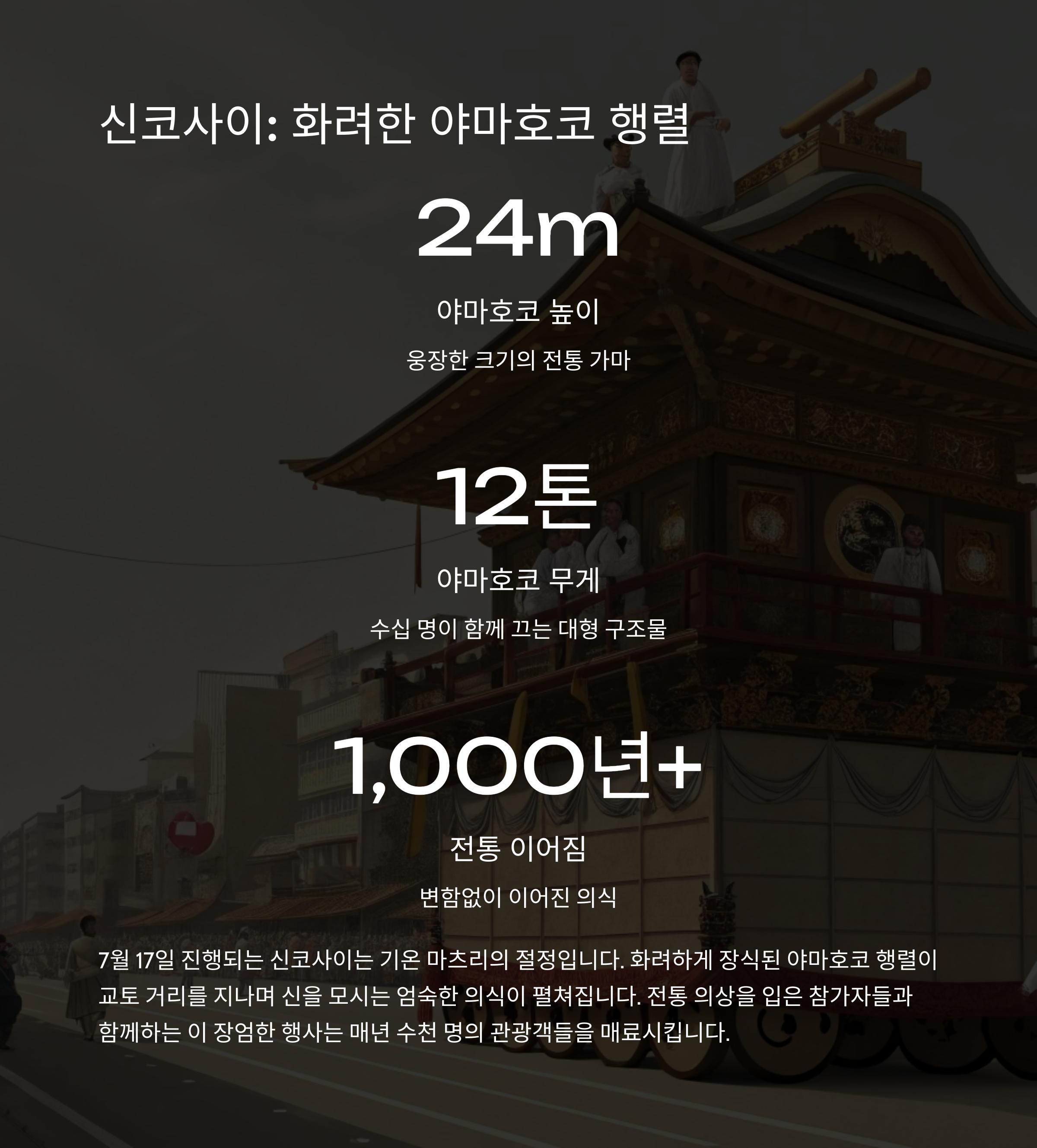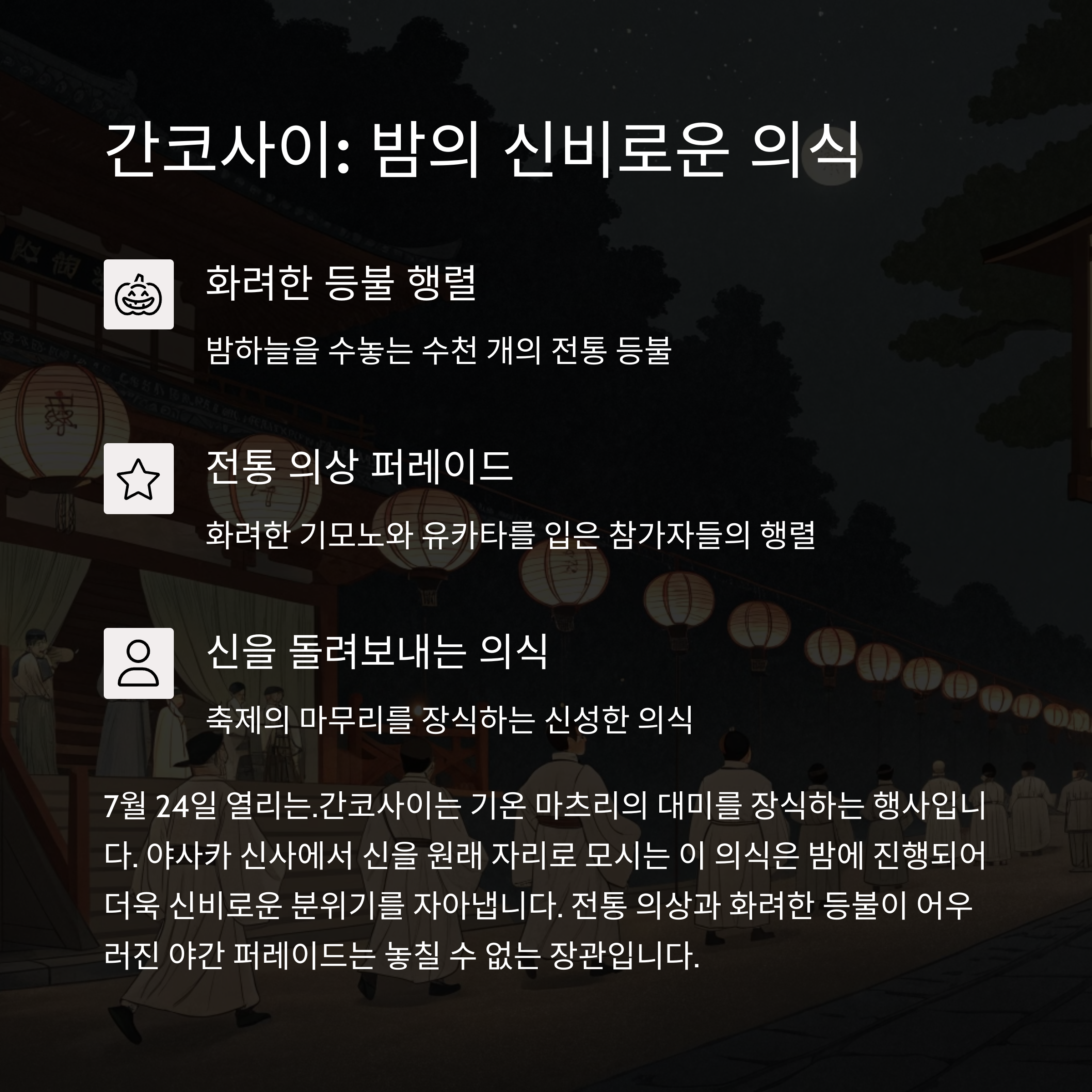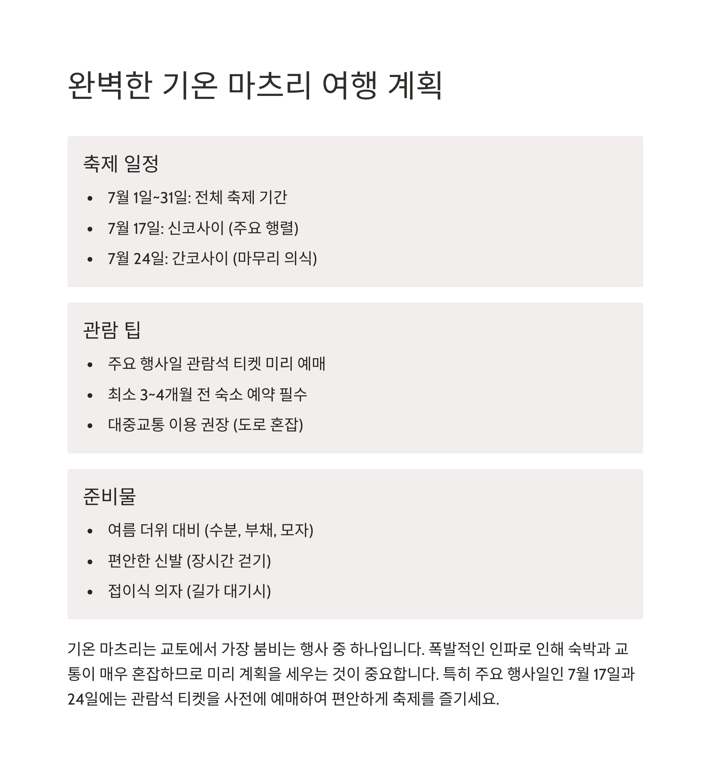 - 교토 기온 마츠리는 일본의 대표 여름 축제로, 야사카 신사의 축제입니다.
