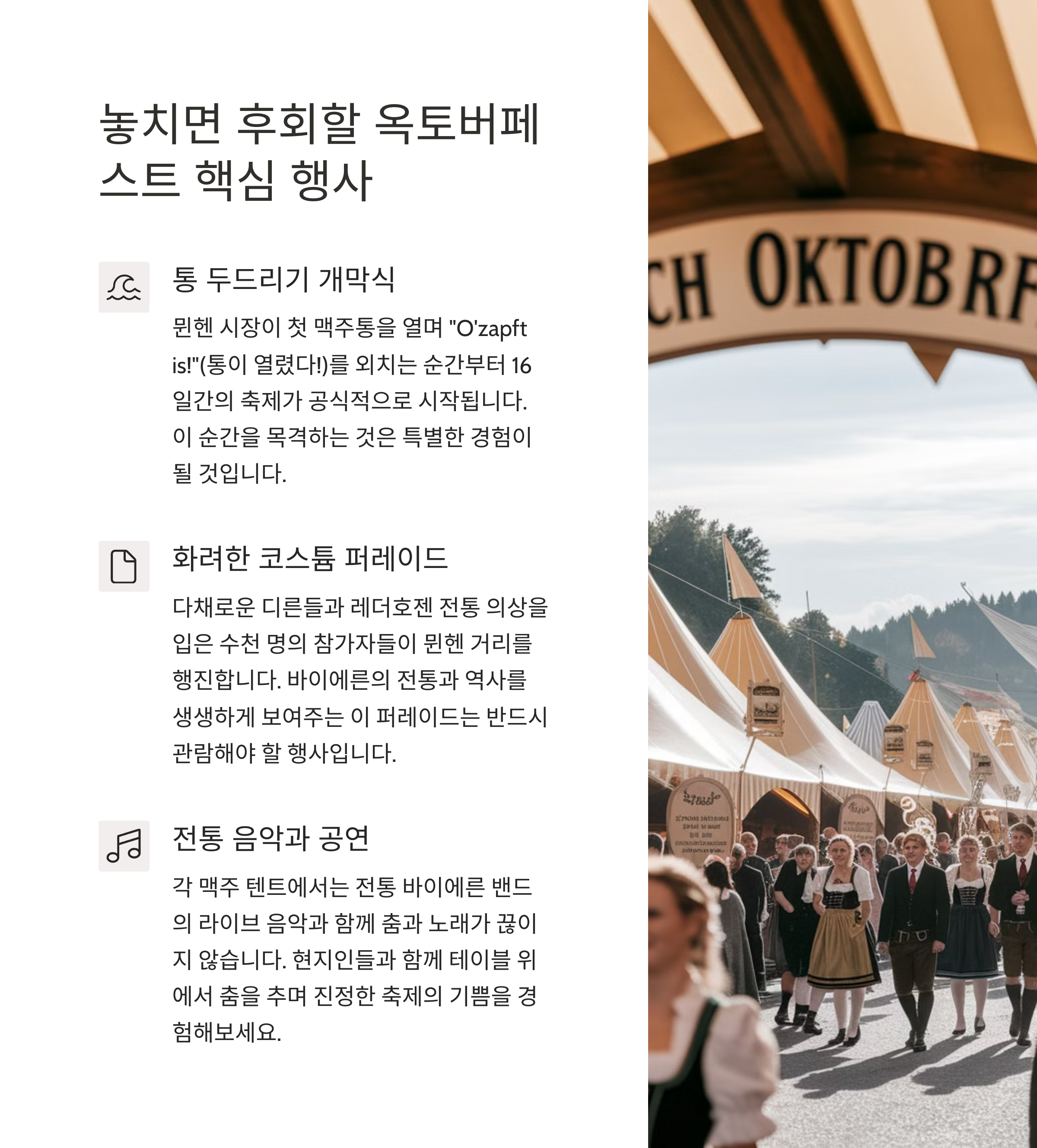 - 바이에른 전통 음식, 맥주, 퍼레이드 등 볼거리와 즐길 거리가 넘칩니다.