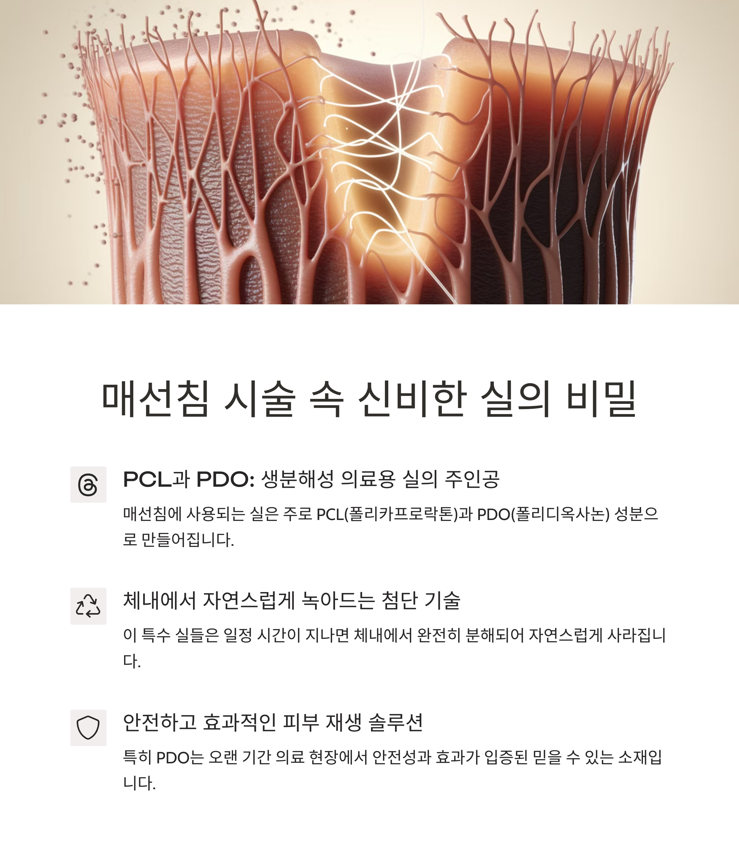 대부분의 매선침 시술에는 PCL(Polycaprolactone) 혹은 PDO(Polydioxanone) 성분의 실이 사용돼요.