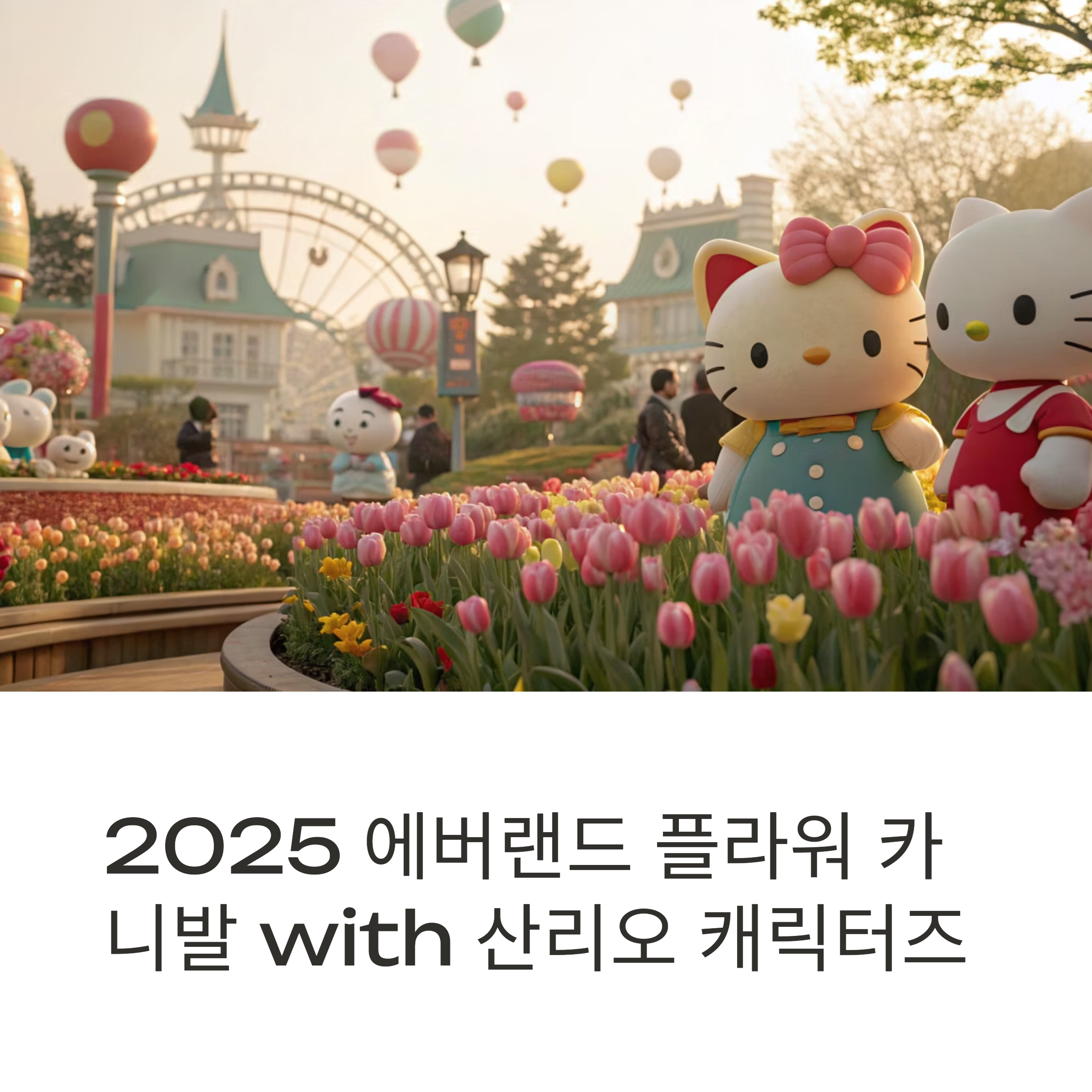 2025년 에버랜드는 ‘플라워 카니발 with 산리오 캐릭터즈’라는 이름으로 봄의 가장 아름다운 순간을 선사합니다. 특히 헬로키티, 마이멜로디, 쿠로미 등 산리오의 인기 캐릭터 9명과 함께한 포토존은 많은 관람객들에게 큰 인기를 끌고 있습니다.