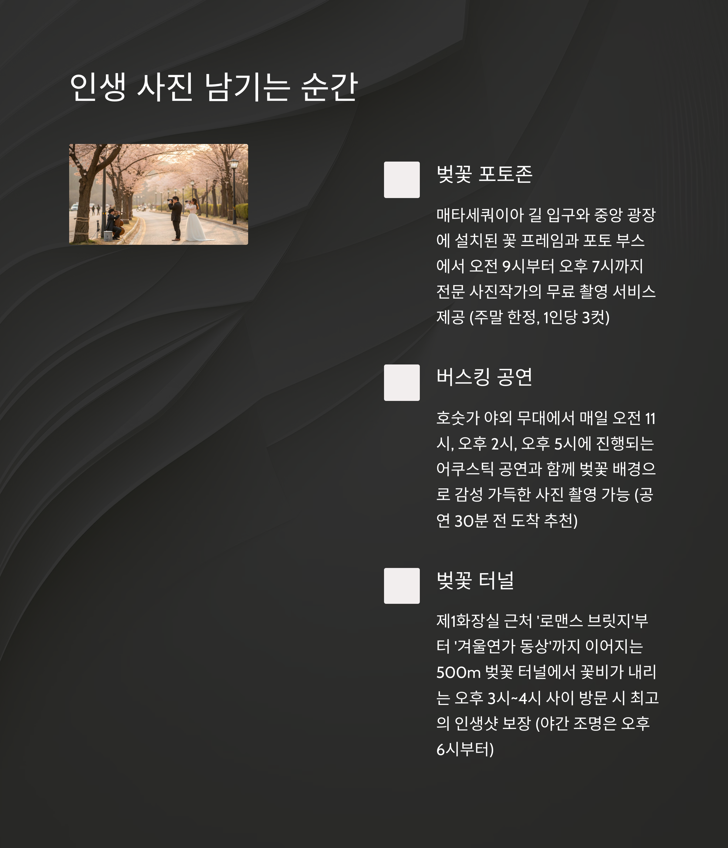 - 포토존과 꽃놀이는 사진 촬영과 동시에 자연을 즐길 수 있는 기회를 제공합니다.
