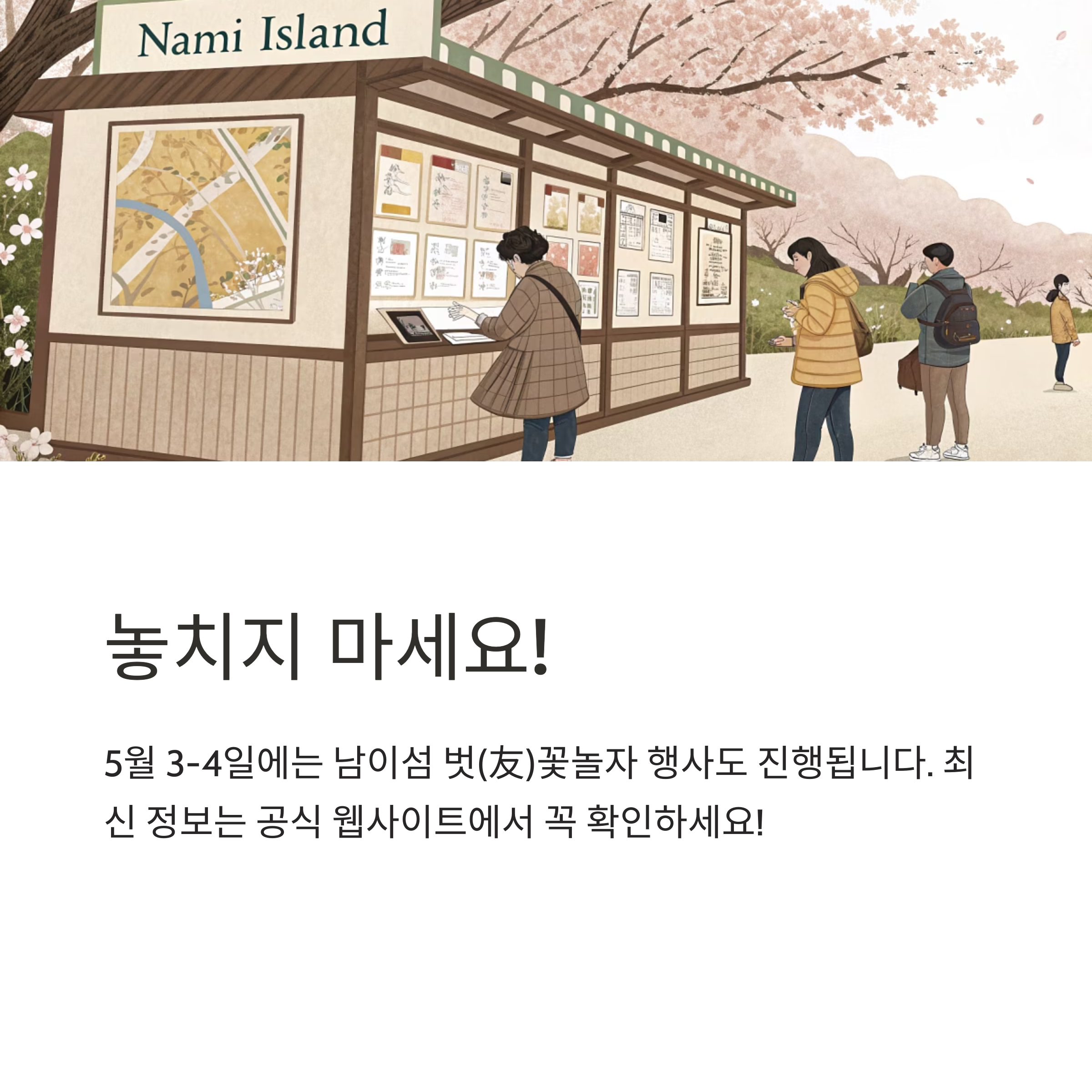 | 벚꽃 포토존 | 남이섬 매화길 & 자작나무길 | 핸드메이드 마켓 | 수공예품 및 꽃 장식 액세서리 |