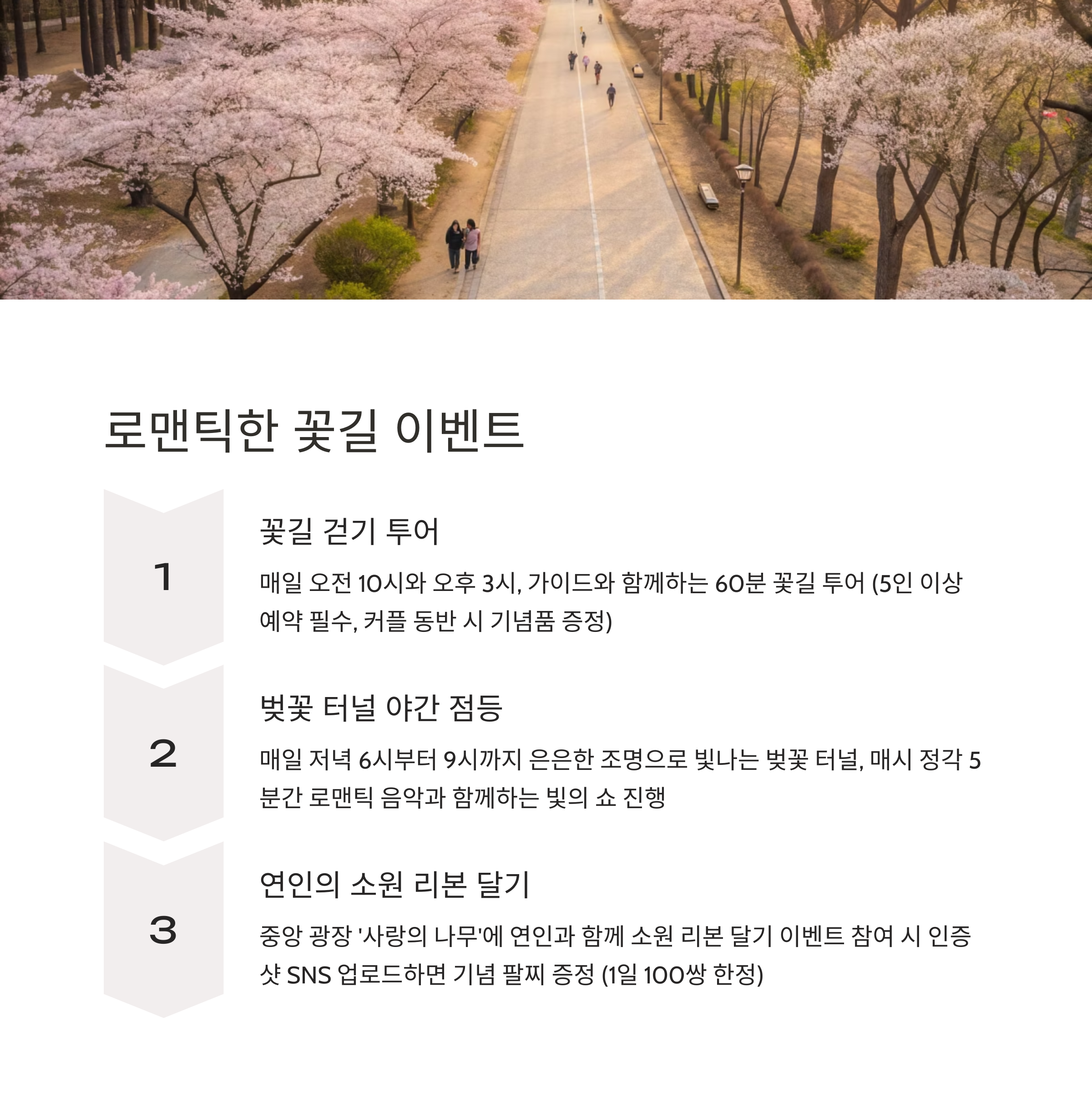 바람에 흩날리는 벚꽃 속에서 산책을 하거나, 창의적인 핸드메이드 공예품을 구매하며 특별한 추억을 만드는 시간을 가져보세요!