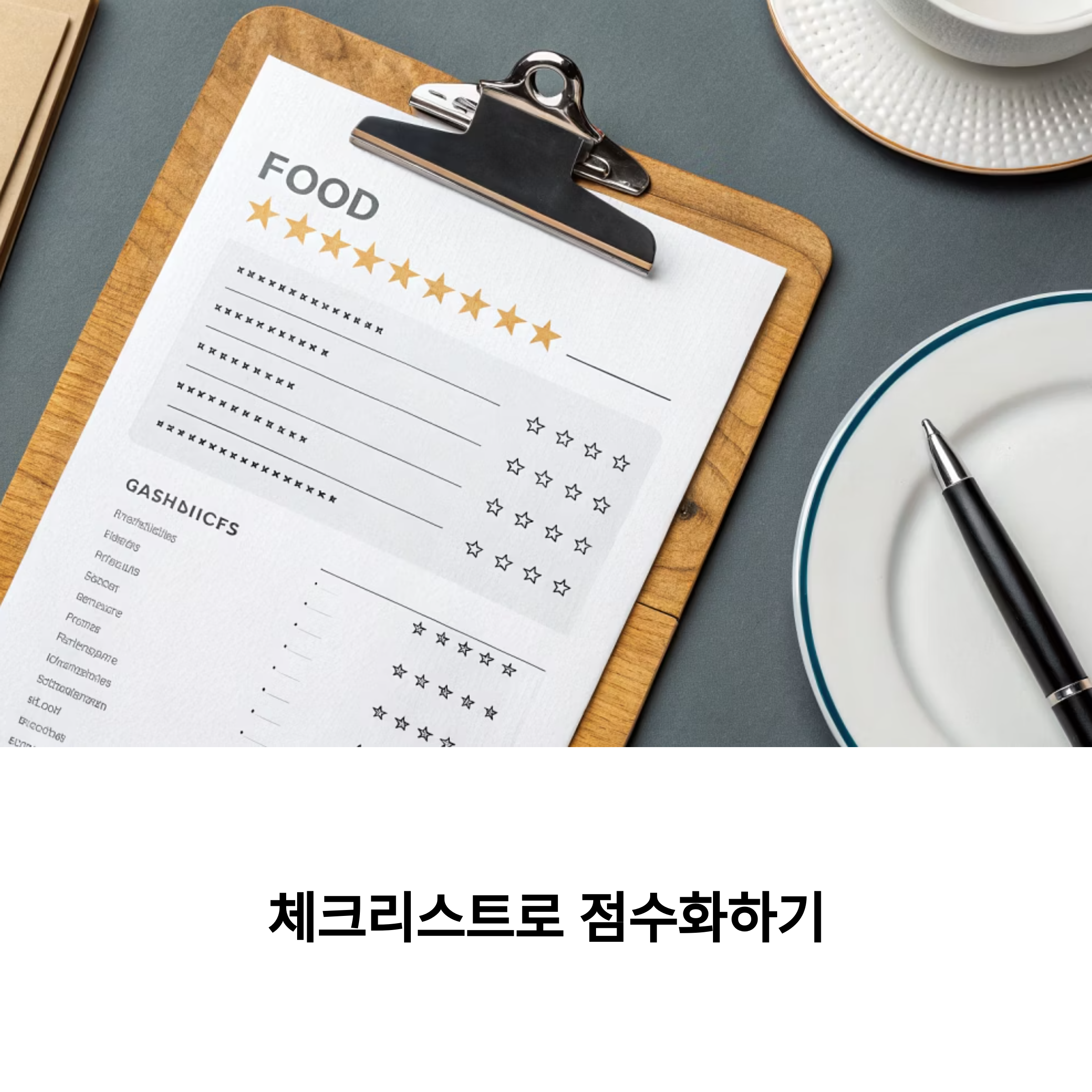 - 간단한 항목부터 시작해보세요. 맛, 향, 식감, 온도, 서비스, 청결 등 5~6가지로도 충분합니다.