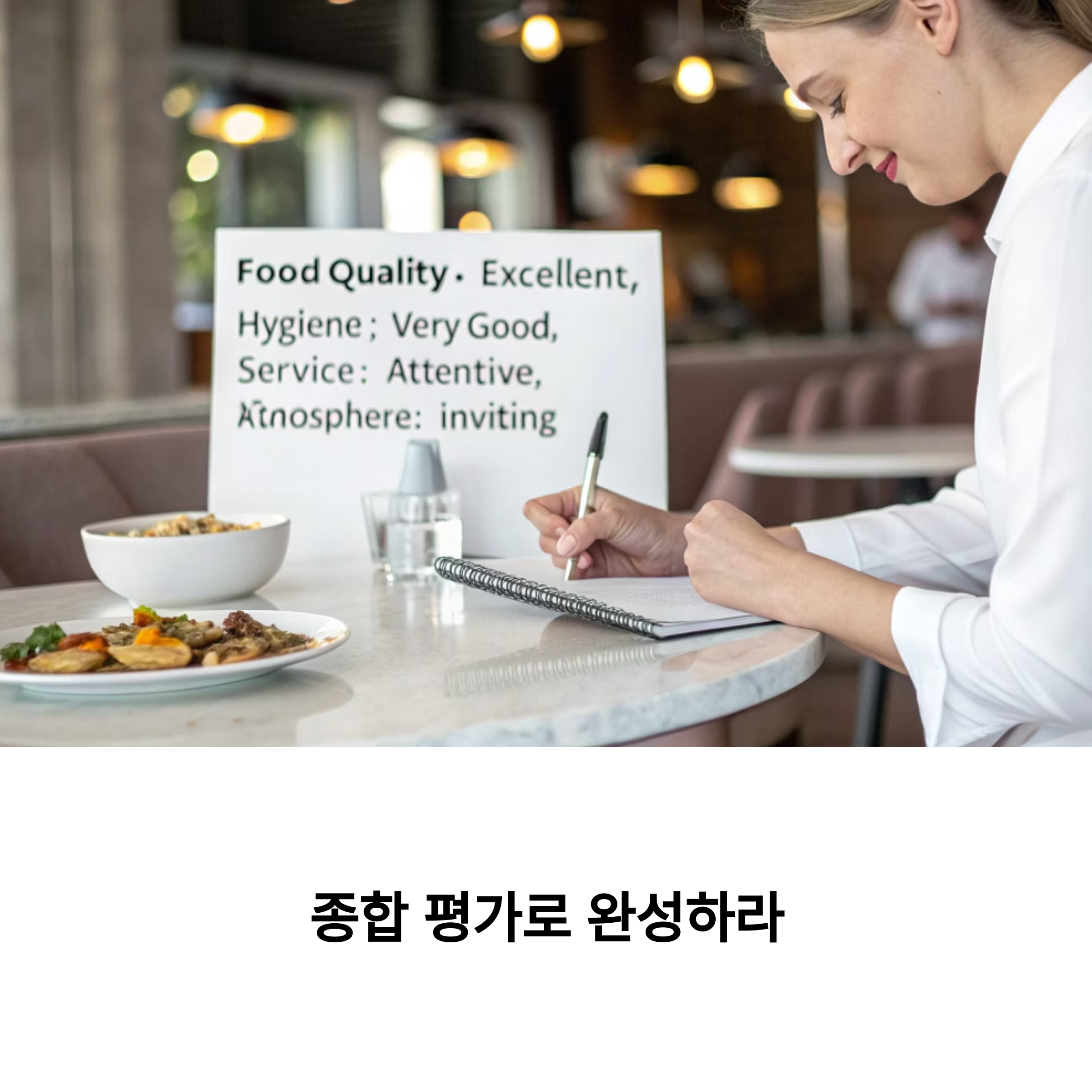 - 맛, 향, 식감, 온도, 플레이팅, 청결, 서비스 등 항목별로 5~10점 만점 체크리스트를 만들어 점수화하세요.