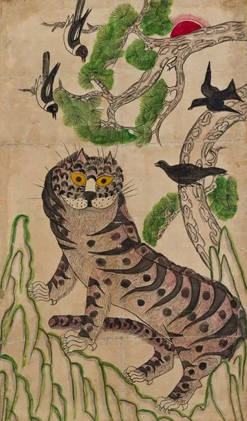 🐯 호랑이는 권위를, 까치는 길운을 의미하는 민화예요. 그러나 조선 시대 민화 속 호랑이는 무섭기보다는 **익살스럽고 우스꽝스러운 모습**으로 등장해요. 이는 백성들이 현실의 권력자들을 풍자하면서도 **유머를 통해 삶의 고단함을 극복하려 했다는 철학**을 담고 있어요.