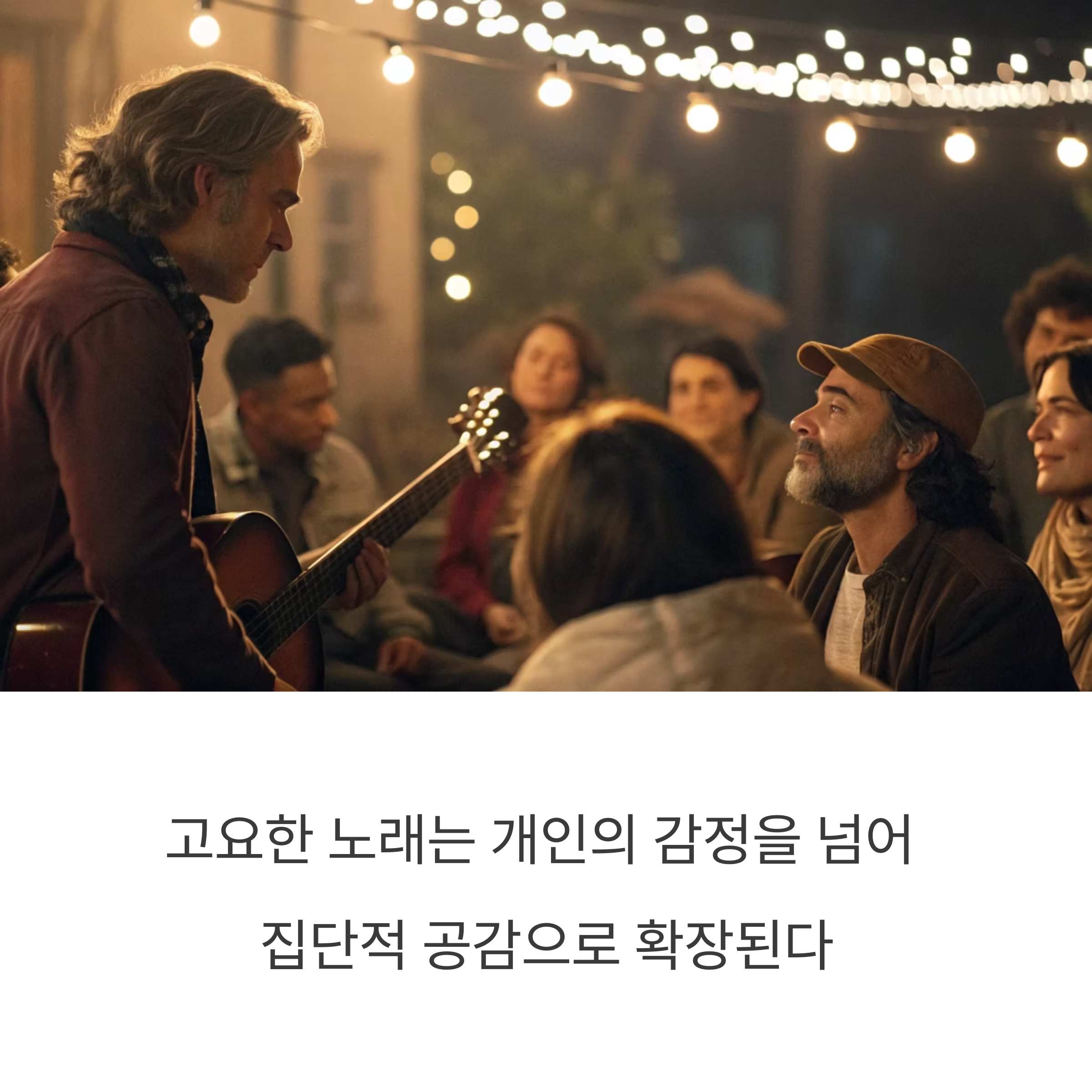 "슬픈 노래를 함께 들으며 위로를 얻고, 고요한 합창 속에서 서로의 감정이 하나로 이어지는 경험—음악은 집단적 공감의 힘을 보여줍니다."