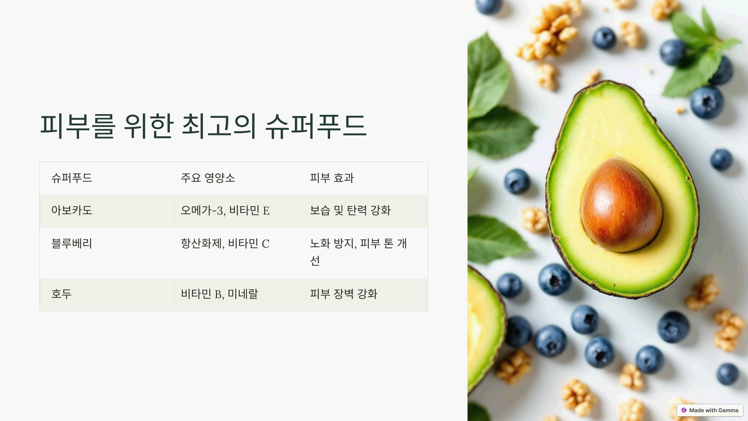 | 슈퍼푸드 | 주요 영양소 | 피부에 미치는 효과 |