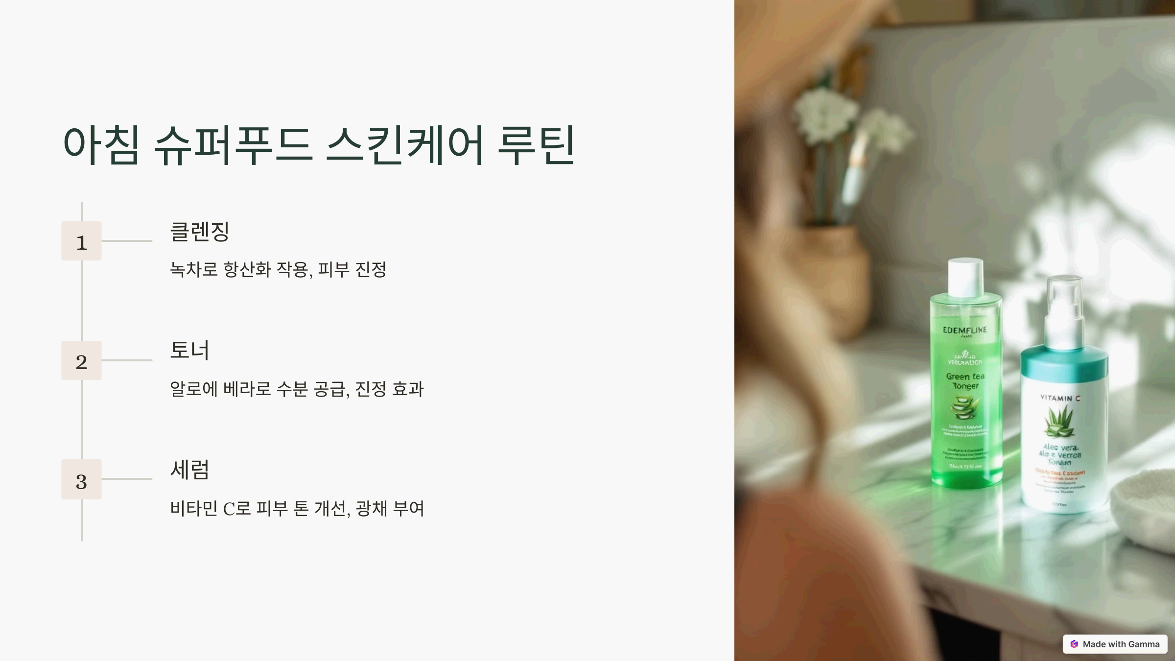 아침에는 밤새 쌓인 노폐물을 제거하고, 피부를 보호하는 것이 가장 중요합니다. 슈퍼푸드를 활용한 아침 루틴을 통해 하루 종일 건강하고 생기 있는 피부를 유지해 보세요!