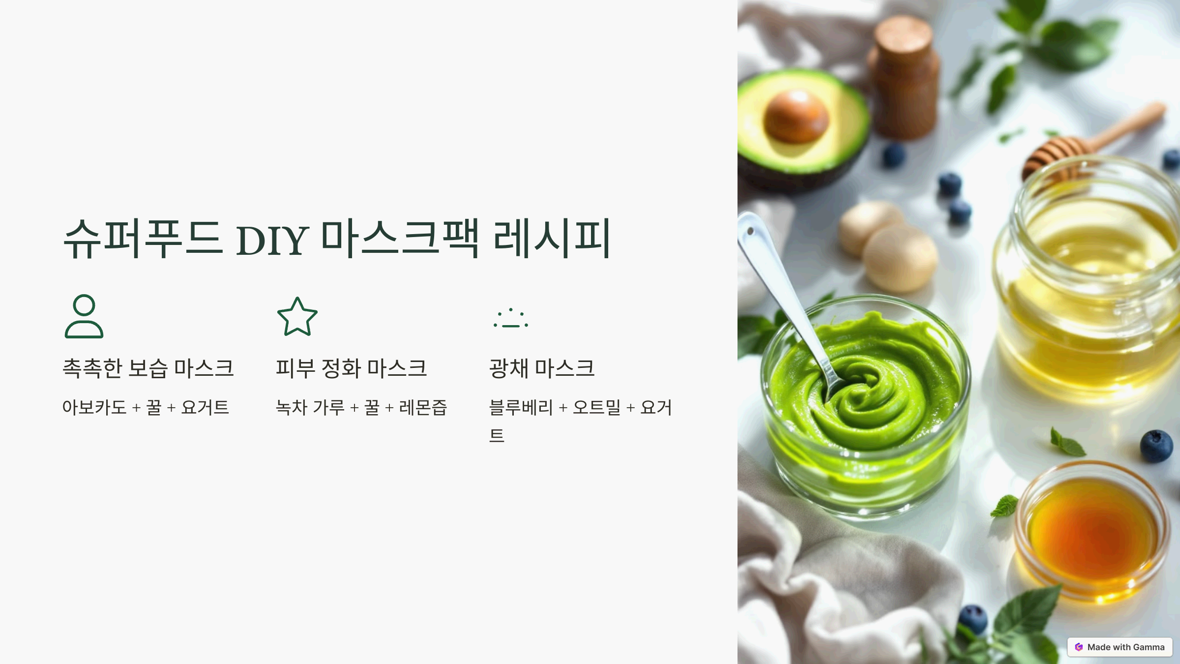 화학 성분이 가득한 시중 마스크팩 대신, 집에서 쉽게 만들 수 있는 천연 마스크팩을 사용해보세요. 슈퍼푸드를 활용하면 피부에 더욱 건강한 영양을 공급할 수 있습니다.
