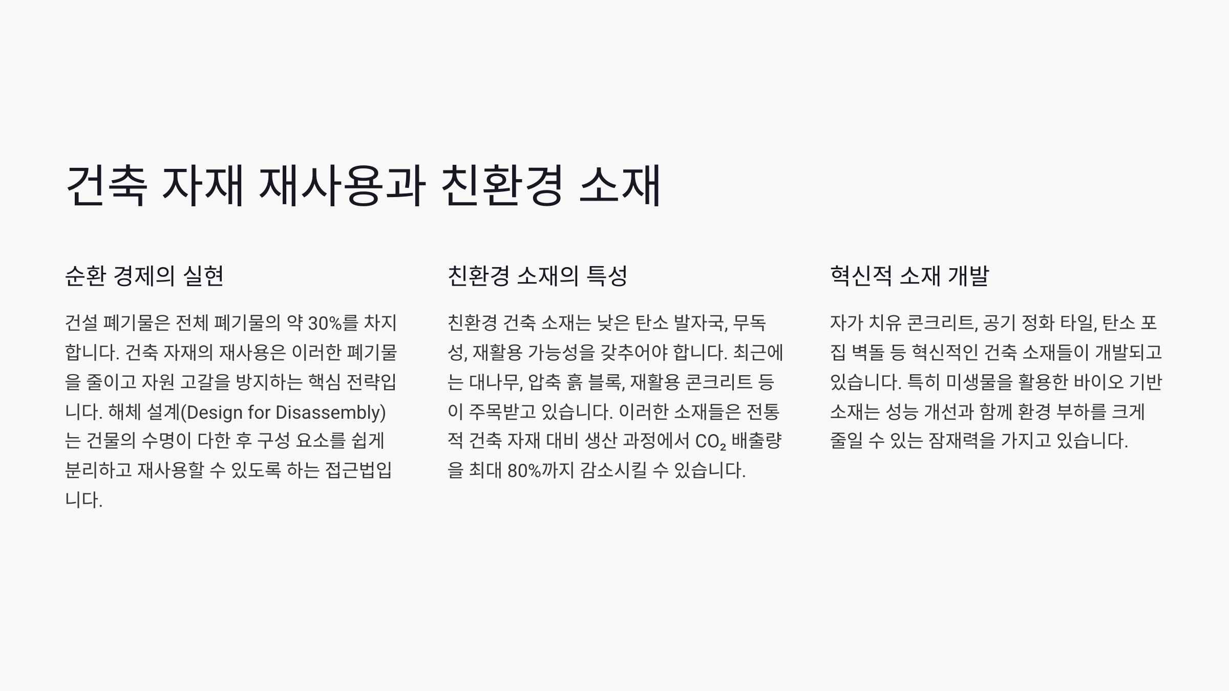 | 친환경 콘크리트 | 산업 부산물 활용 | CO₂ 배출량 최대 50% 감소 |