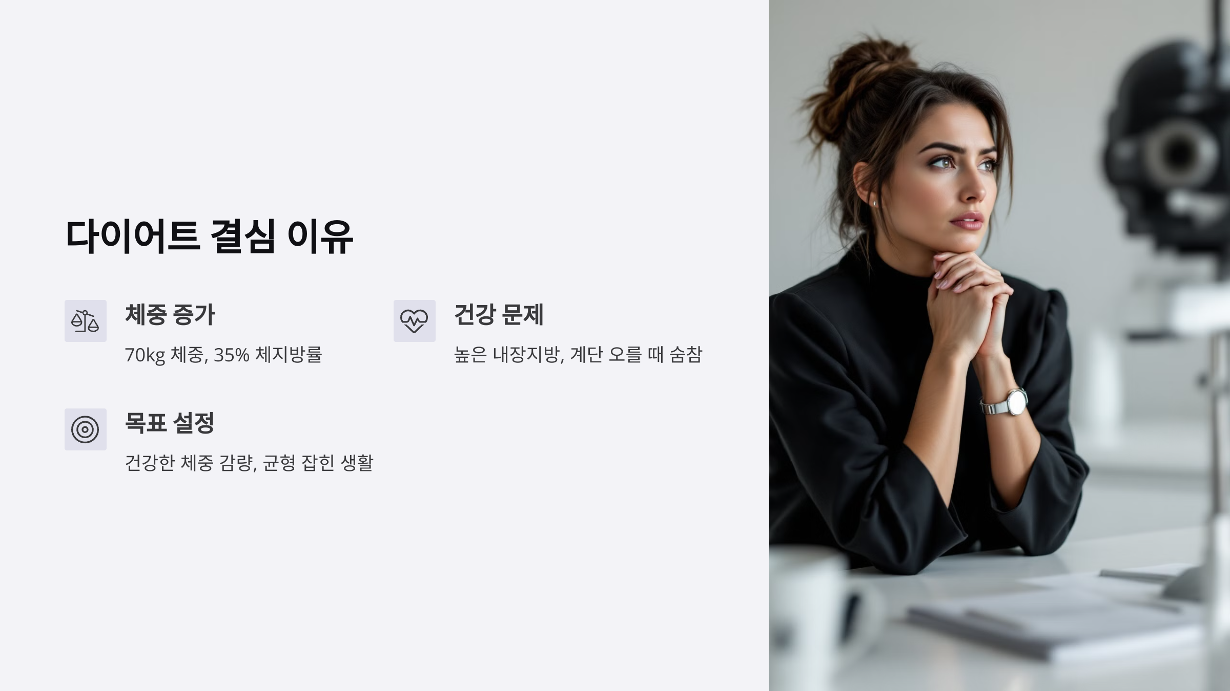 주인공인 A씨(30세, 여성)는 70kg의 체중을 유지하던 평범한 직장인이었습니다. 하지만 바쁜 회사 생활과 불규칙한 식습관 때문에 몸이 점점 무거워지고, 계단을 오를 때조차 숨이 차는 자신을 발견했습니다. 특히 건강검진 결과에서 체지방률이 35%에 육박하며, 내장 지방 수치가 높은 것을 확인한 후 다이어트를 결심했습니다.