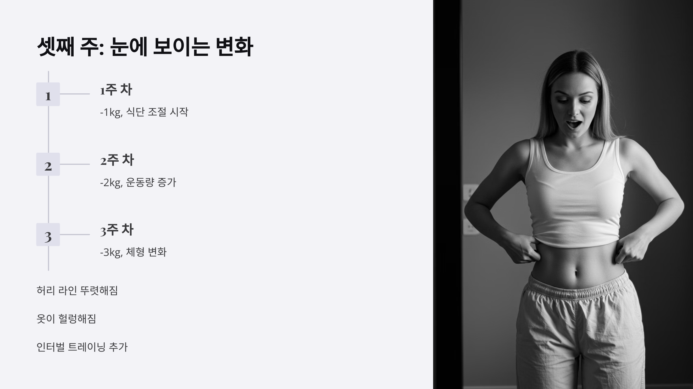 | 3주 차 | -3kg | 체지방 감량 & 체형 변화 |