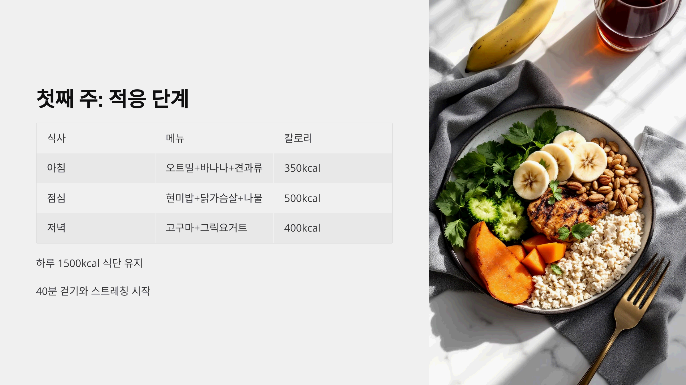 다이어트의 첫 주는 몸이 새로운 습관에 적응하는 시기입니다. A씨는 급격한 변화를 주기보다는 하루 1500kcal를 유지하는 식단을 시작했습니다. 아침에는 단백질과 복합 탄수화물이 포함된 식사를 하고, 점심과 저녁은 야채와 닭가슴살 위주로 구성했어요.