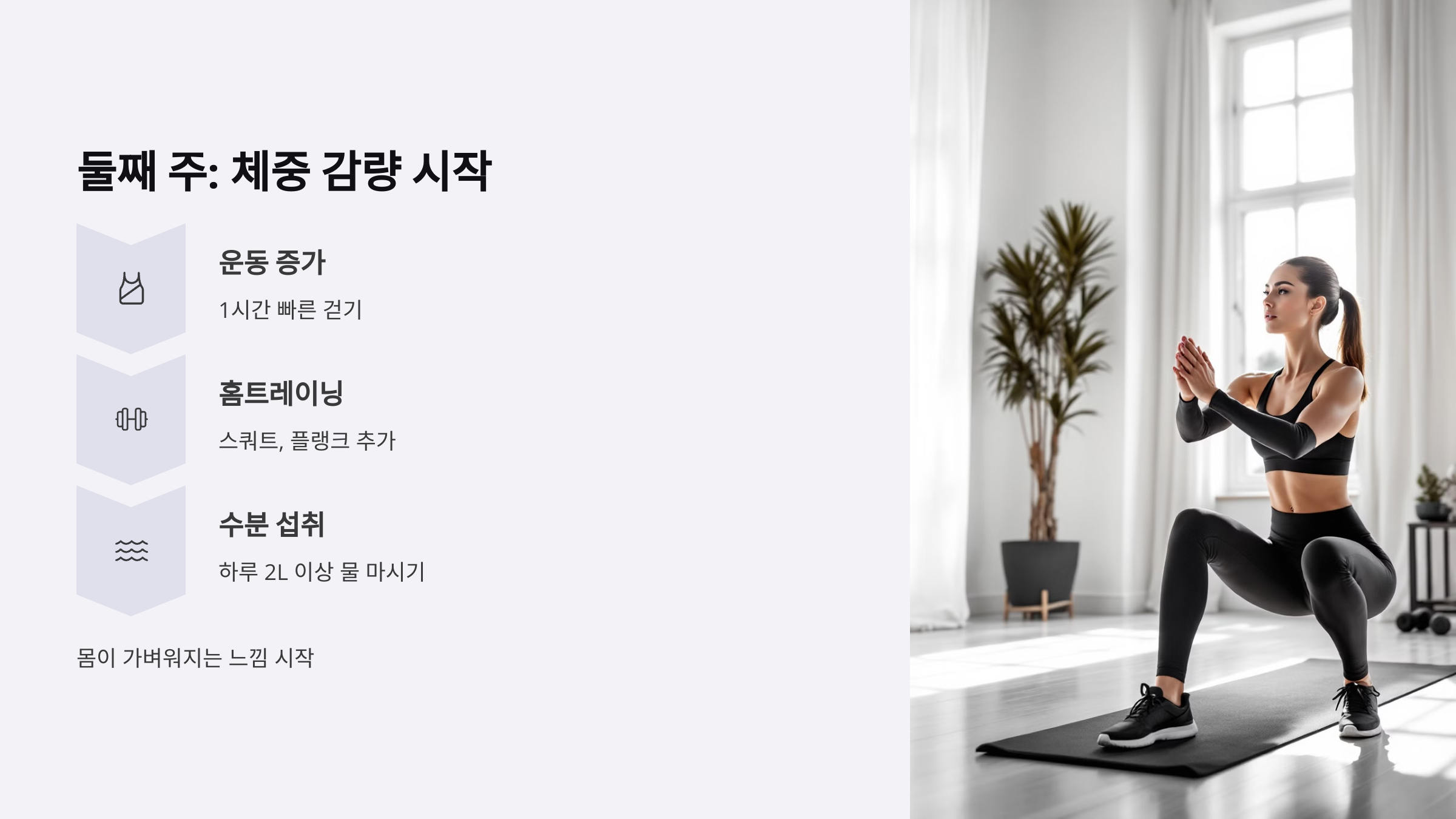 다이어트의 둘째 주에 접어들면서 A씨는 점차 몸이 가벼워지는 느낌을 받기 시작했습니다. 식단을 유지하면서도 운동량을 조금씩 늘렸어요. 하루 1시간씩 빠르게 걷거나 가벼운 홈트레이닝을 추가했습니다.