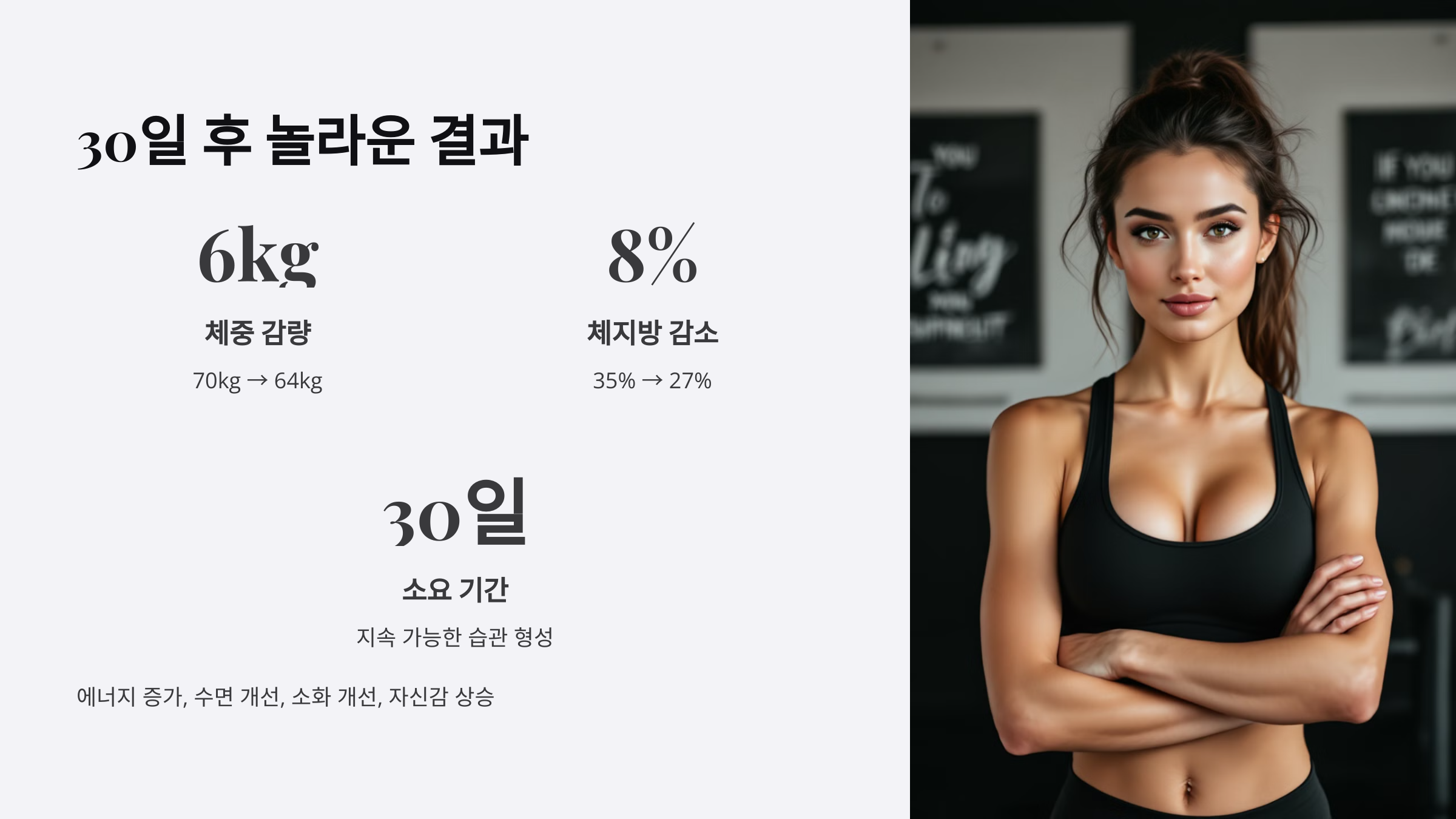 이렇게 30일 동안 꾸준히 노력한 결과, A씨는 단순한 체중 감량을 넘어 건강한 생활 습관을 갖게 되었습니다.