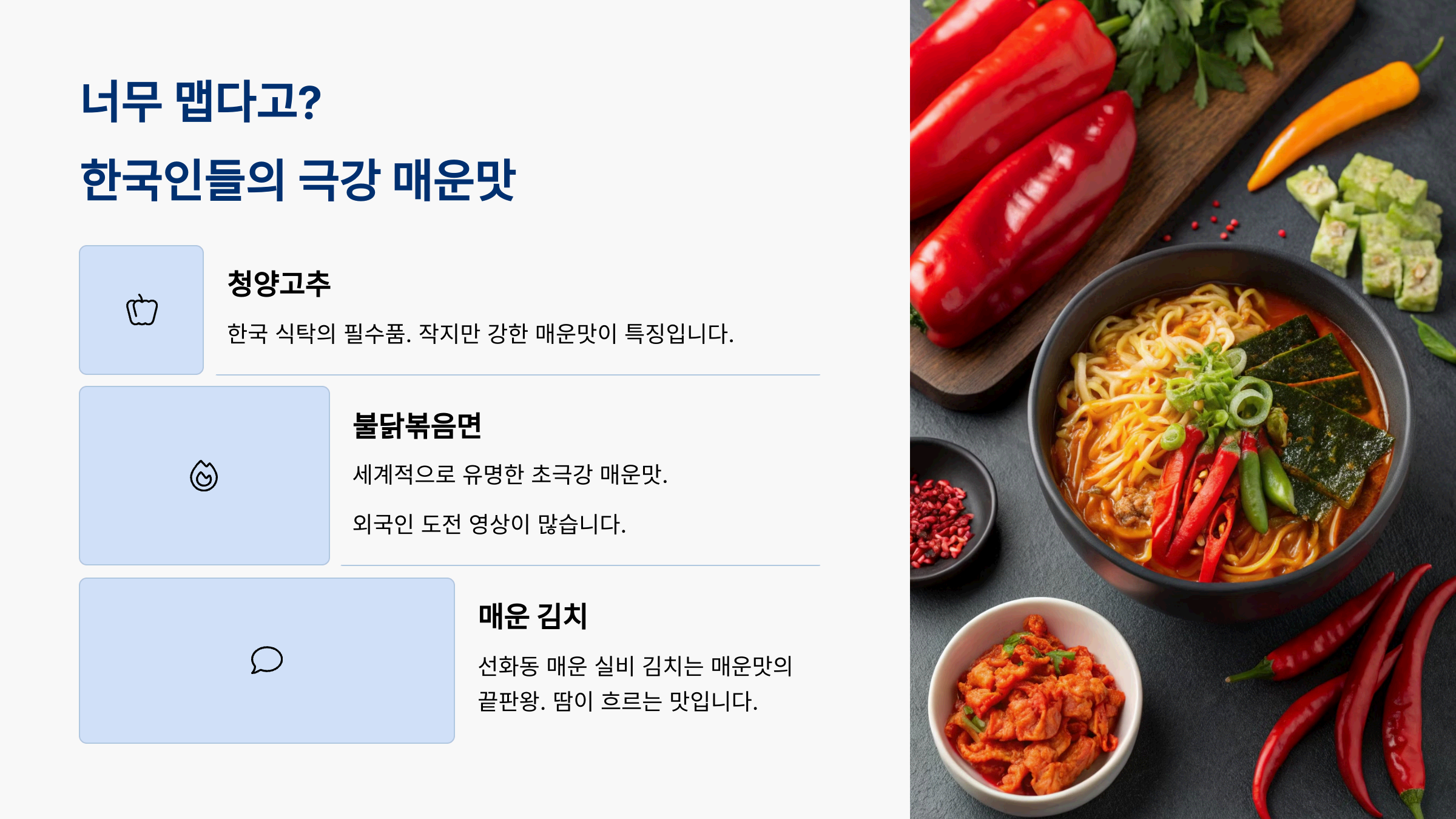 이처럼 한국에는 외국인들이 쉽게 접하기 어려운 다양한 매운 음식이 존재합니다. 하지만 한 번 적응하면 중독될 정도로 맛있다는 점! 매운 음식 마니아라면 한 번쯤 도전해볼 만한 가치가 있는 음식들입니다.