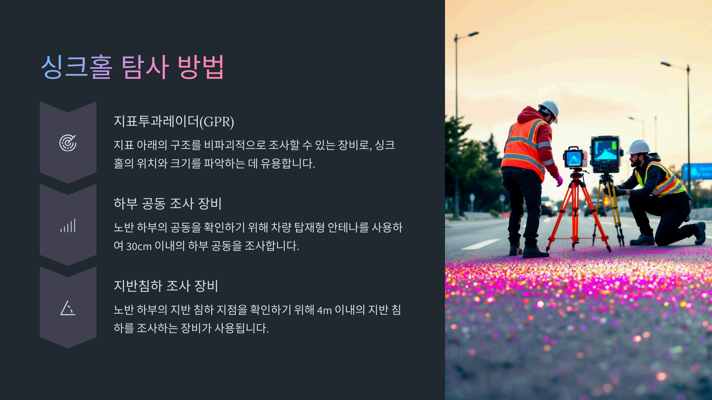 - 지표투과레이더(GPR): 지표 아래의 구조를 비파괴적으로 조사할 수 있는 장비로, 싱크홀의 위치와 크기를 파악하는 데 유용합니다