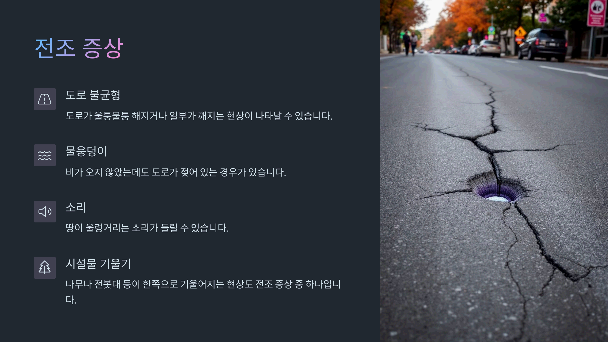 - 도로 불균형: 도로가 울퉁불퉁 해지거나 일부가 깨지는 현상이 나타날 수 있습니다3.