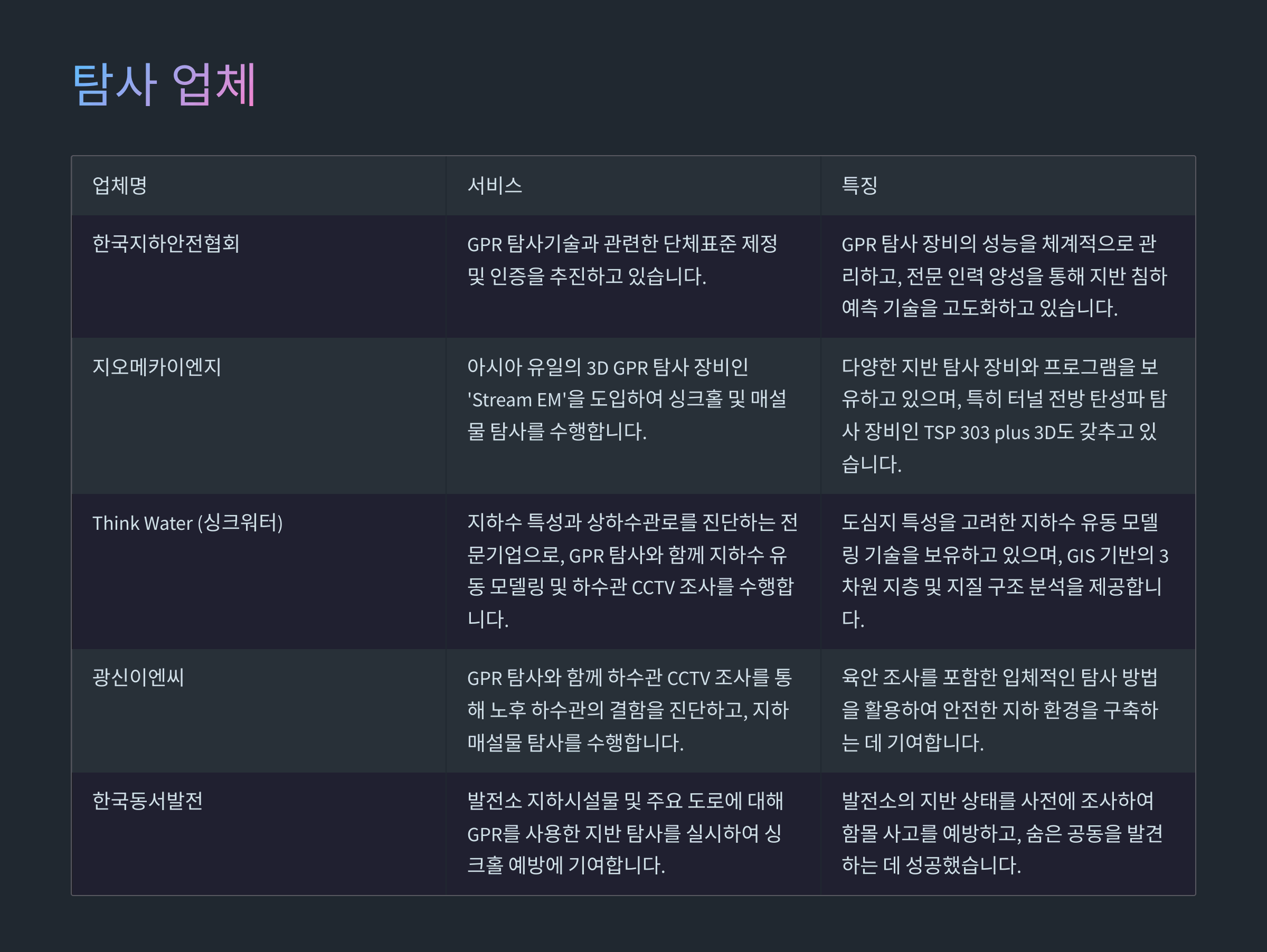 - 서비스: 지하수 특성과 상하수관로를 진단하는 전문기업으로, GPR 탐사와 함께 지하수 유동 모델링 및 하수관 CCTV 조사를 수행합니다3.
