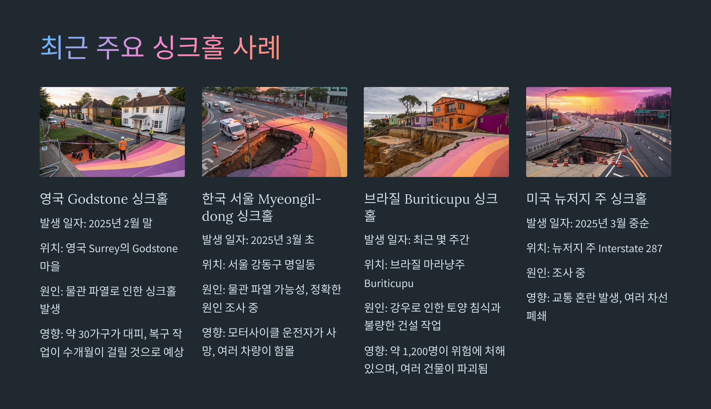 이러한 사례들은 싱크홀이 전 세계적으로 다양한 원인에 의해 발생할 수 있으며, 주로 물관 파열, 토양 침식, 불량한 건설 작업 등이 주요 원인으로 작용하고 있습니다.