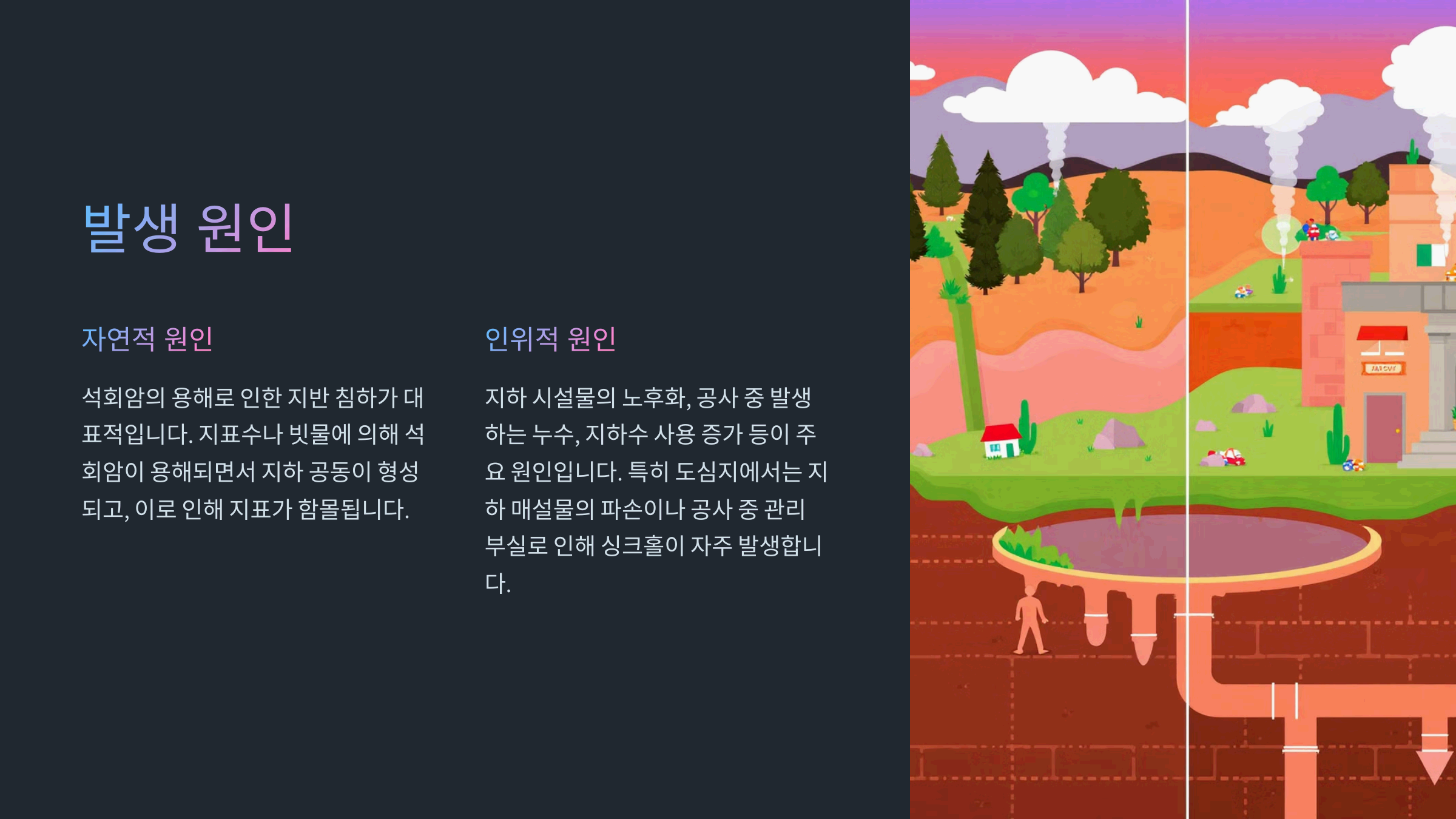싱크홀은 지표면 하부에 있는 공동이 갑작스럽게 발생하여 표층 지반이 함몰되는 현상으로, 주로 자연적 또는 인위적인 원인에 의해 발생합니다2. 자연적 원인은 주로 석회암의 용해로 인한 지반 침하이며, 인위적 원인은 지하 시설물의 노후화나 공사 중 발생하는 누수로 인해 지반의 안정성이 저하되는 경우가 많습니다