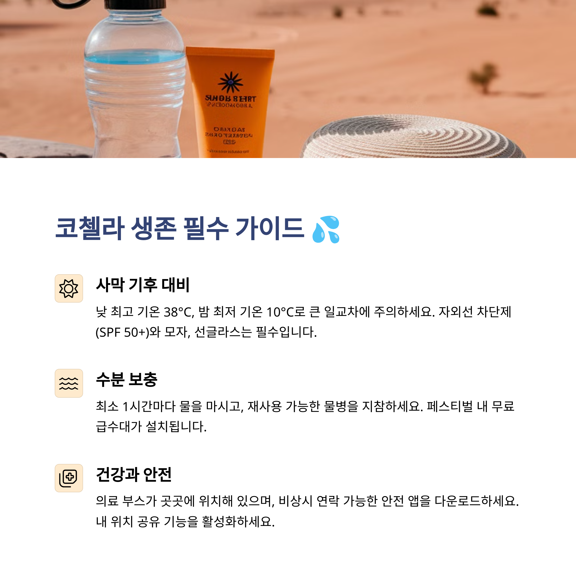 | 티켓 예약이 가장 중요한 준비 단계입니다. 코첼라 티켓은 빠르게 매진되는 경우가 많아, 사전에 일정을 조율하고 공식 플랫폼에서 티켓을 구매하는 것이 필요합니다. 페스티벌 기간 동안 사막의 날씨를 고려해 햇빛 차단제와 충분한 수분 공급을 위한 물병 준비가 필수적입니다. 또, 페스티벌 명소로 가는 교통편, 주차 예약, 또는 캠핑 준비를 철저히 해야 합니다. 마지막으로, 현장에서의 경험을 더욱 즐겁게 만들기 위해 모바일 지도 및 일정표 다운로드를 권장합니다. |