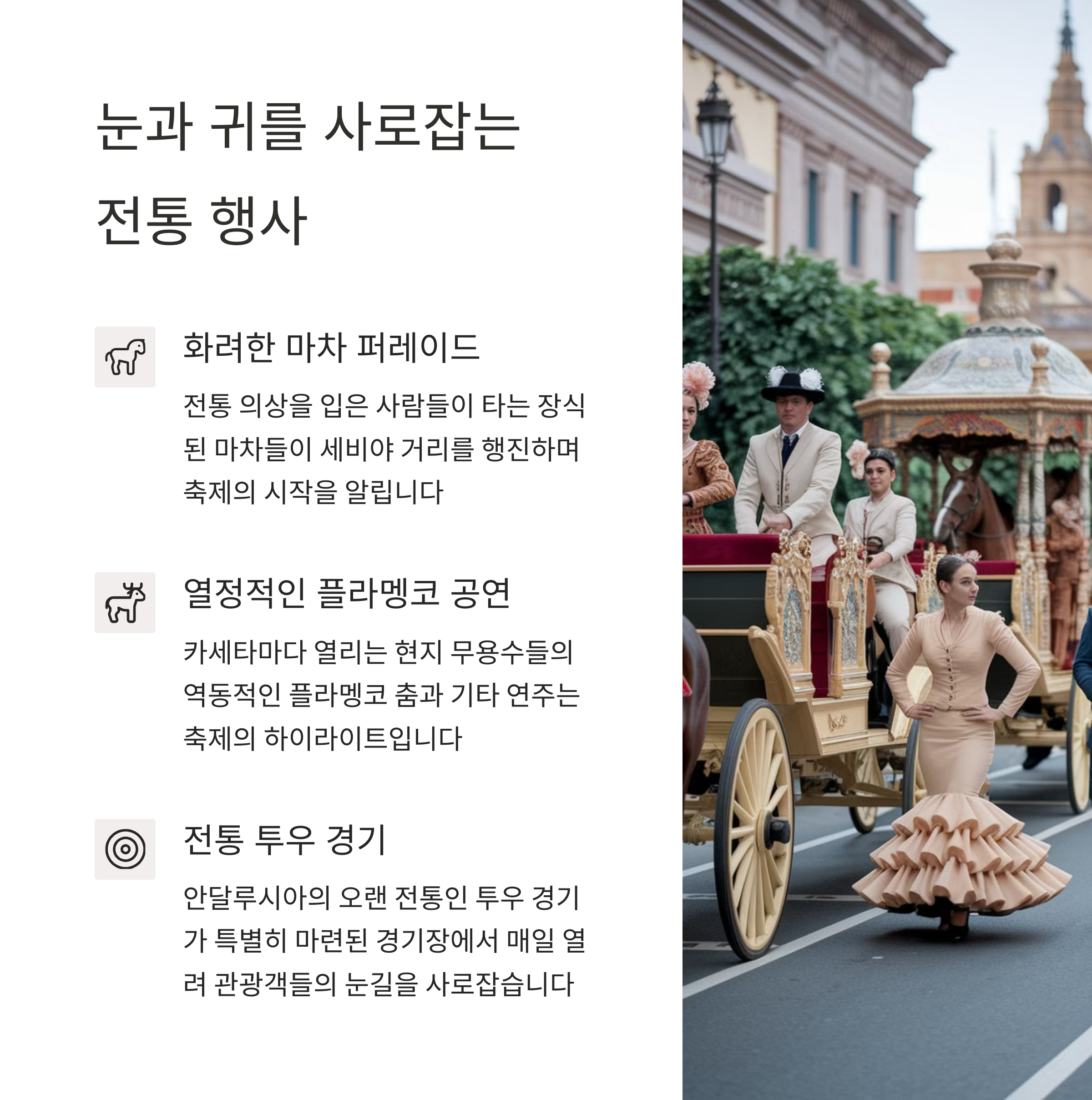 매년 전 세계에서 수많은 방문객들이 참여하며, 플라멩코 공연과 마차 퍼레이드 등의 다채로운 행사로 모두를 사로잡습니다.