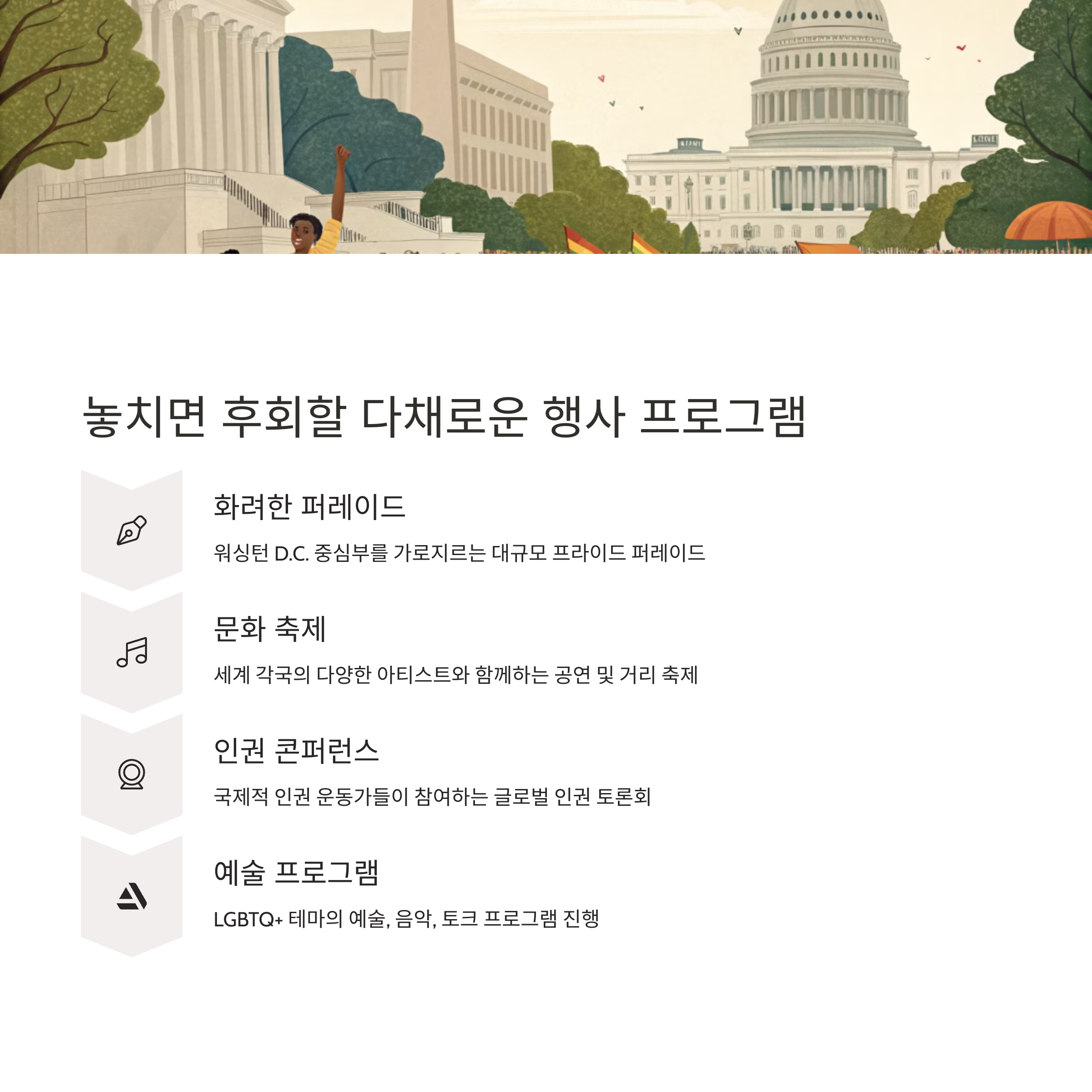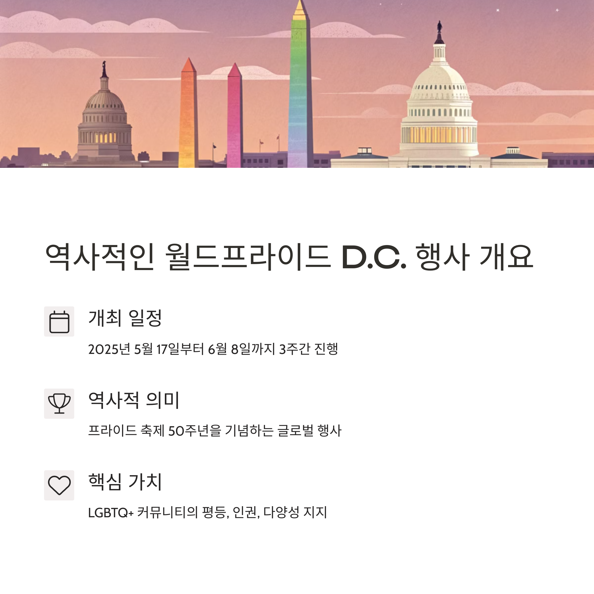 2025 워싱턴 D.C.의 월드프라이드는 다양성과 포용성을 기념하는 글로벌 이벤트로, 지역 경제 및 관광에도 긍정적인 효과를 가져올 것입니다.