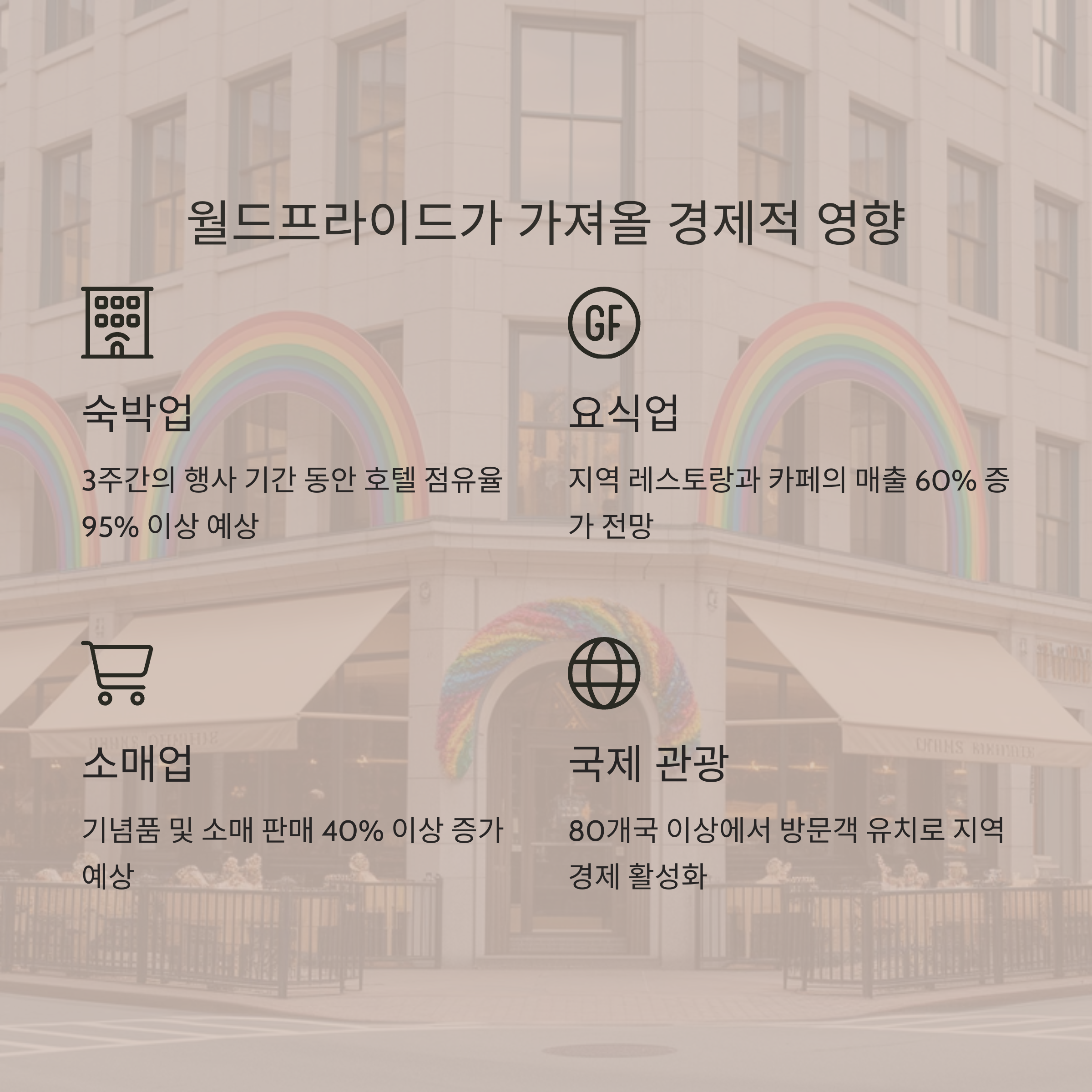 | 월드프라이드 2025는 지역 경제에 매우 긍정적인 영향을 미칠 것으로 예상됩니다. 호텔 예약 수요가 크게 증가하여 관광 수익이 상승할 것입니다. 레스토랑 및 소매업 역시 방문객의 소비로 인해 호황을 맞을 것입니다. 이벤트 관련 일자리 창출은 경제 성장에 기여할 것입니다. 지역 명소는 추가적인 입장수익과 관광객들의 관심을 받을 것입니다. 이러한 경제적 효과는 지속 가능성을 높이는 데 도움을 줄 것입니다. |